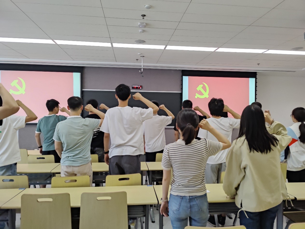 在硕1004党支部全体成员热烈欢迎赵法博同志转正之后,刘桂蕾同志带领硕1004党支部全体同志举起右臂面向党旗,庄严宣誓入党,党支部的新老同志们在党旗的感召下慷慨激昂,在重温入党誓词中不断强化思想入党。在热烈的掌声中入党仪式圆满结束,大会第一项内容也圆满结束。