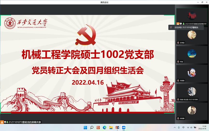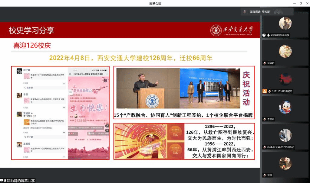 为庆祝18禁直播 126周岁生日、传承弘扬西迁精神、向同学们充分展现交大126年办学历程,本支部于2022年4月16日在线上举行了本月的组织生活会,组织支部同志学习交大历史,为母校庆生。