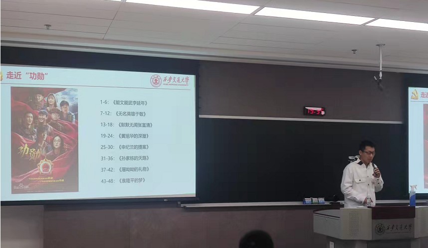 王昊同学通过播放孙家栋同志的功勋事迹视频和生动形象的描述,让大家了解到一个勤奋、有胆识、爱国的功勋,并引用了一句话作结语:不要怕乌云一时遮住了天,真理是藏不住的,就像包在纸里的火,反而烧的更加猛烈!不由得让我们对孙家栋同志产生由衷的敬佩之情。芶杨蕴藉同学从笃定信念跟党走、战火硝烟写忠诚、永葆本色当好兵三个方面介绍了始终保持党员和军人革命本色、居功不自傲、自身要求严的老英雄李延年,阐述了自己对功勋描绘的老英雄的敬佩之情,还表达了自己对《功勋》和《长津湖》两部文艺作品的看法和思考。