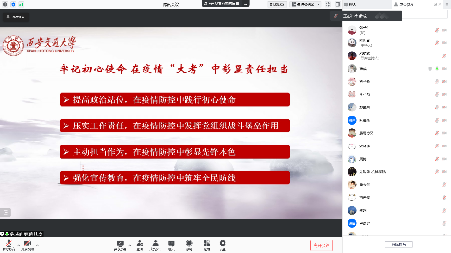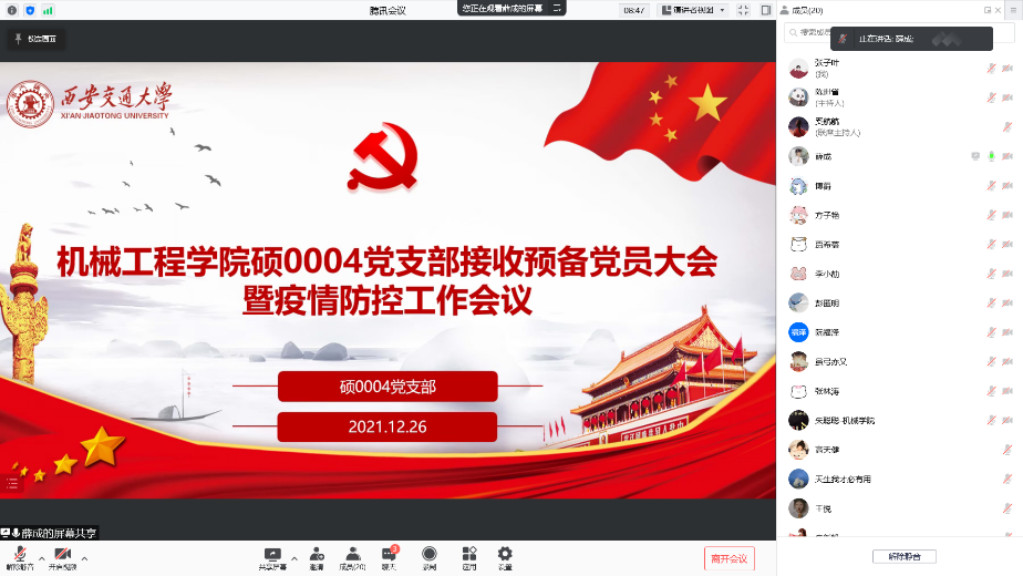 硕0004党支部线上召开接收预备党员大会。同时,针对近期西安日趋严峻的疫情防控态势,党支部根据学校、学院要求,向与会成员传达学校、学院疫情防控工作会议精神,部署安排支部内疫情防控工作。