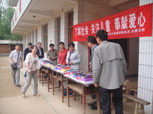 机关支部与仪器支部积极响应学院分党委开展“创先争优”活动的号召,组织党员深入农村小学,进行了“了解社会、关注儿童、奉献爱心”的主题活动。两个支部来到蓝田县三里镇李后村小学,为15位特困生送去了书包、文具等学习用品,鼓励学生们好好学习,报效祖国,并且和李后村村支书及小学校长、老师进行座谈、交流,了解村办小学的现状和存在问题。