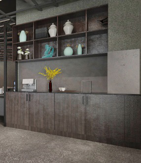(三)墙面装饰柜:一套,投影面积16.5平米。外尺寸5000*400*3300mm,板材采用无醛实木板材,甲醛释放量0.04mg/L以内。