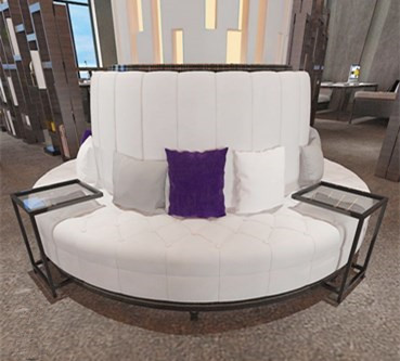 (四)中央圆形卡座:4个,外圆半径1275mm,内圆半径425mm,各1/4圆。内部采用钢架结构,海绵采用高密度“锦洋”海绵,面覆优质荔枝纹皮,久坐不变形。板材采用无醛实木板材,甲醛释放量0.04mg/L以内。