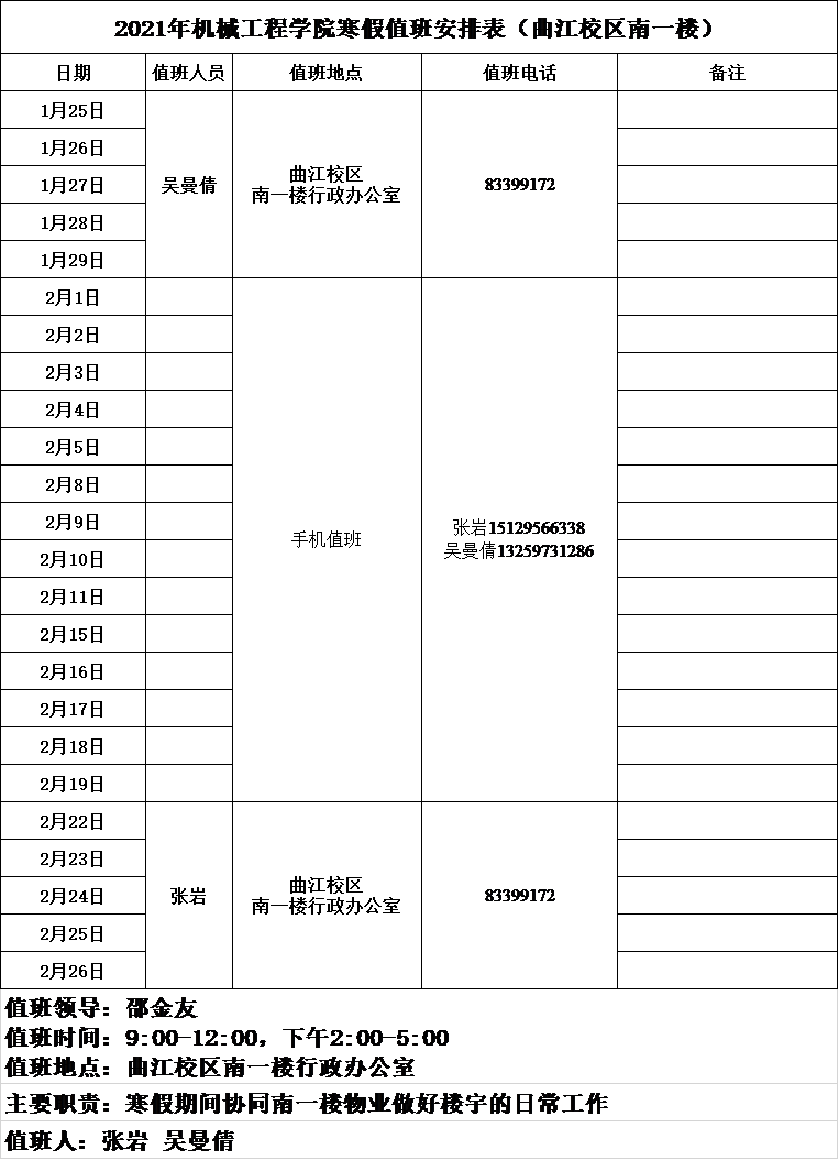 2021年18禁直播 寒假值班安排(曲江南一楼)