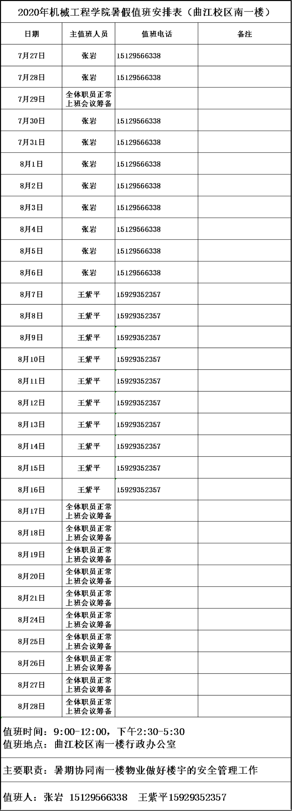 2020年18禁直播 暑假值班安排表(曲江校区南一楼)