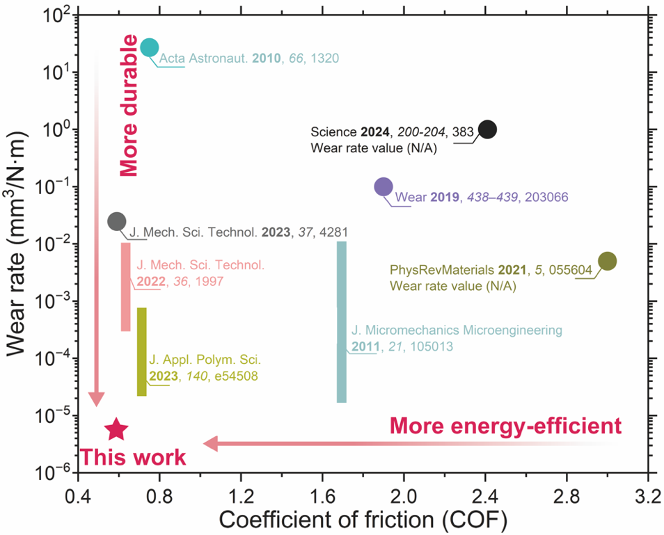 秦立果团队和杨森教授团队采用磁辅助3D打印定制化打印区域的机械性能,所制备的传感器封装层耐磨性能远超同类(见图2)。研究团队创新性地在打印体系内加入由磁诱导制备的二维纳米链条作为增强相,在不增加柔性基底刚度的同时,克服其摩擦系数高(本工作相比纯聚二甲基硅氧烷降低了27.7%)及耐磨性差的难题。在长时间的寿命试验中,定制化的传感器表现出了优异的抗磨损性能,定制化的封装层可以推广至更多的柔性穿戴器件。在传感层方面,利用分子动力学揭示了液态金属本征亲柔性基底的特点,通过机械外力破除其氧化层使其更好地与基底粘接,实现可控的液态金属打印。这一工作为可穿戴设备长期服役带来了一种新的设计方法,可以有效地保护传感器延长其使用寿命,推动柔性穿戴设备领域发展。