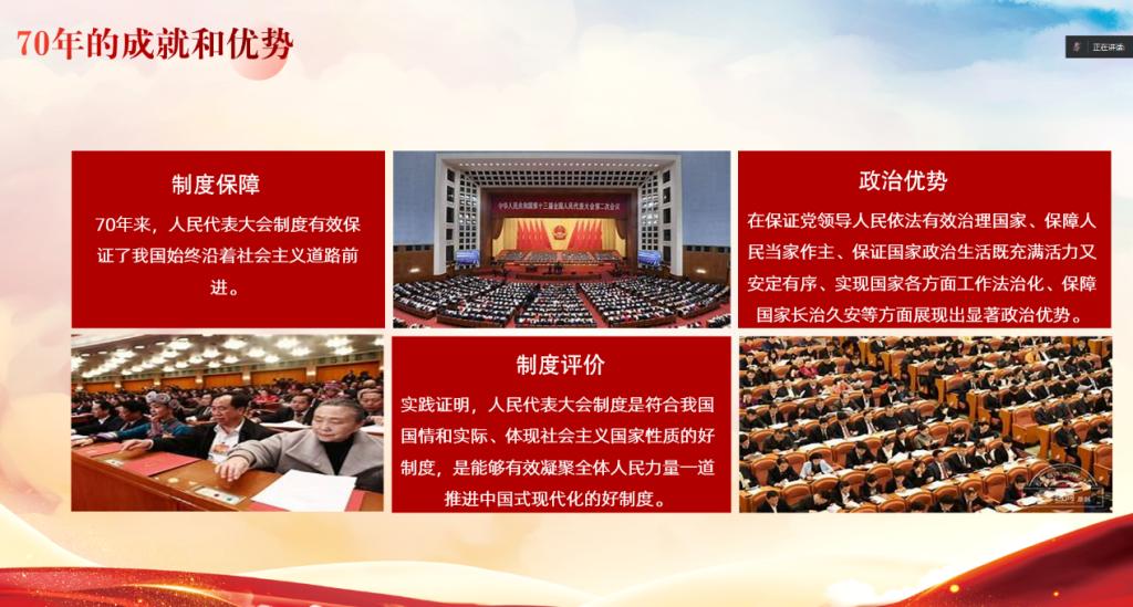 会议第二部分就习近平总书记在庆祝全国人民代表大会成立70周年大会上重要讲话进行学习,黄宏同志介绍了党的十八大以来的成就。十八大以来,我们党确立了新的历史方位,我们党深刻把握我国社会主要矛盾的新变化,积极回应人民群众对民主法治的新要求新期盼;完成了制度创新,健全人大组织制度和工作制度,推动人大工作取得历史性成就;实现了理论和实践创新,坚持把马克思主义基本原理同中国具体实际相结合、同中华优秀传统文化相结合,持续推进人民代表大会制度理论和实践创新;形成了重要思想,形成了一系列新理念新思想新要求,为新时代推动人大工作高质量发展提供了根本遵循。